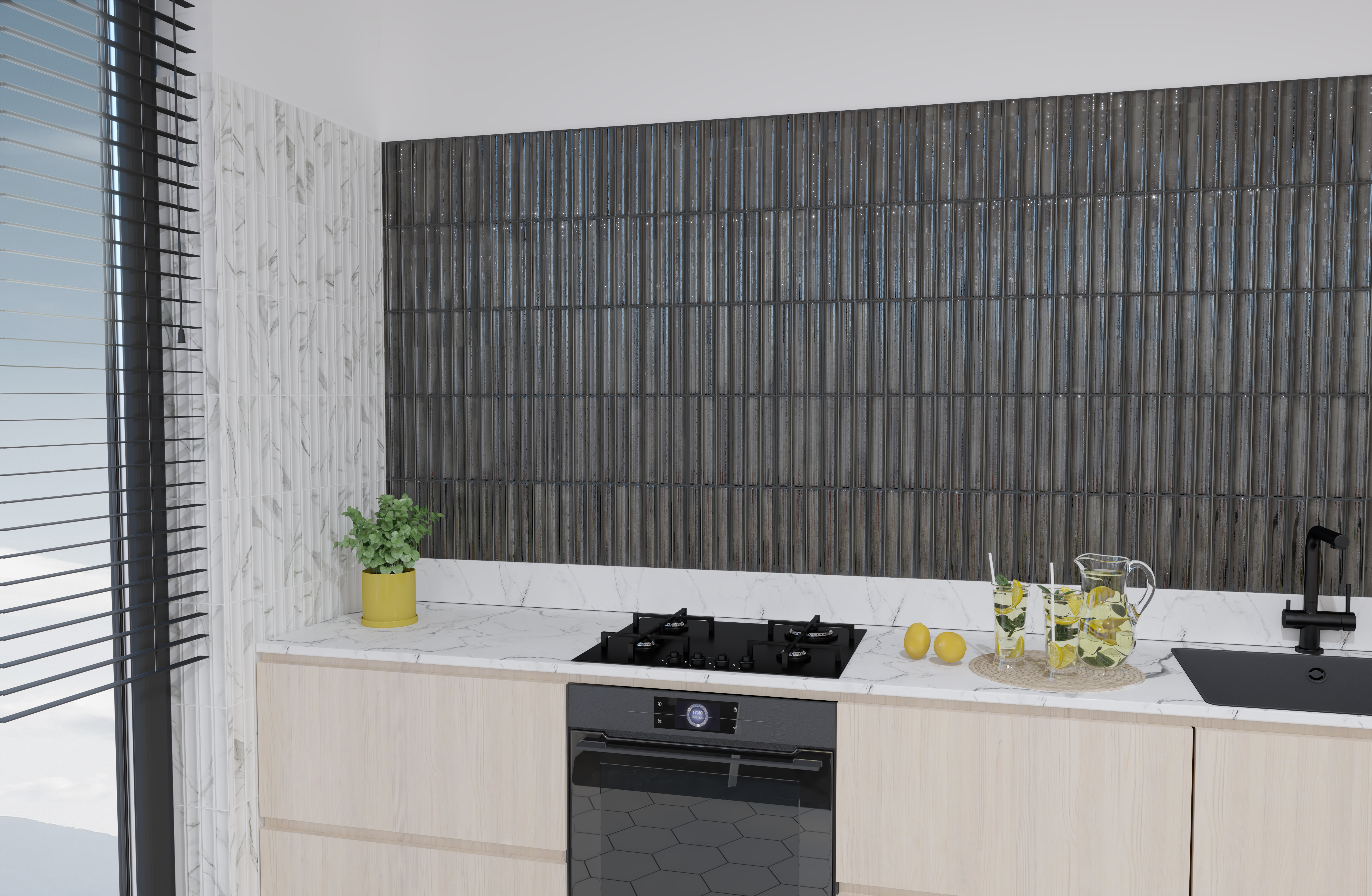 Płytka Kanji Black zachwyca połyskiem, głębią i detalem powierzchni. Każdy egzemplarz odzwierciedla wpływy rzemieślnicze, widoczne w strukturze i wykończeniu. Aż 24 unikalne warianty "twarzy" w jednym opakowaniu sprawiają, że ściana zyskuje dynamiczny, ręcznie formowany charakter. Dzięki temu nawet minimalistyczna aranżacja nabiera unikalnego wyrazu i elegancji.